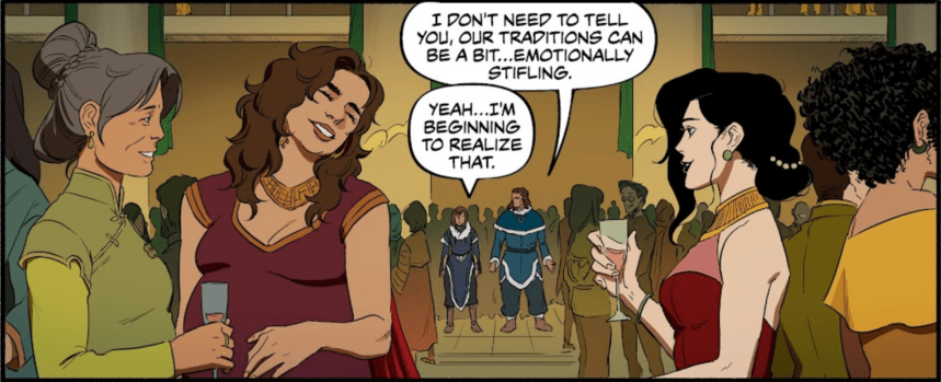 Le problème de Korra, et c’est quelque chose qu’on observe durant toute la série animée, c’est qu’elle est un personnage un peu immature qui a beaucoup de mal à apprendre de son vécu et à se remettre en question. En fait, si on analyse bien chaque saison, on se rend compte qu’au fond, elle n’évolue pas beaucoup, elle ne sort pas “grandit“ de ses épreuves. On le voit encore très clairement dans ce tome. Elle est incapable de prendre le temps d’explorer ses nouveaux sentiments. Non, il faut tout de suite qu’elle aille faire son coming out à ses parents. C’est trop rapide pour rien. C’est dommage car je trouvais cool que le livre prenne le temps de développer ses sentiments mais finalement, pas plus que ça. Ensuite, elle veut carrément annoncer sa relation au reste du monde et se fâche contre son père quand il lui suggère plutôt d’être prudente, conseil plus qu’avisé. Je peux comprendre son impétuosité car au-delà d’être l’Avatar, elle a aussi sa propre personnalité. En revanche, j’ai du mal à saisir son irascibilité quasi systématique quand quelque chose ne lui plaît pas. Elle a un côté un peu enfant gâtée et elle manque trop de recul pour quelqu’un qui a vécu tout ce qu’elle a vécu. Elle fonce toujours tête baissée sans jamais se poser ne serait-ce qu’une minute pour réfléchir, comme on peut encore le voir avec ses joutes répétées avec Raiko.
