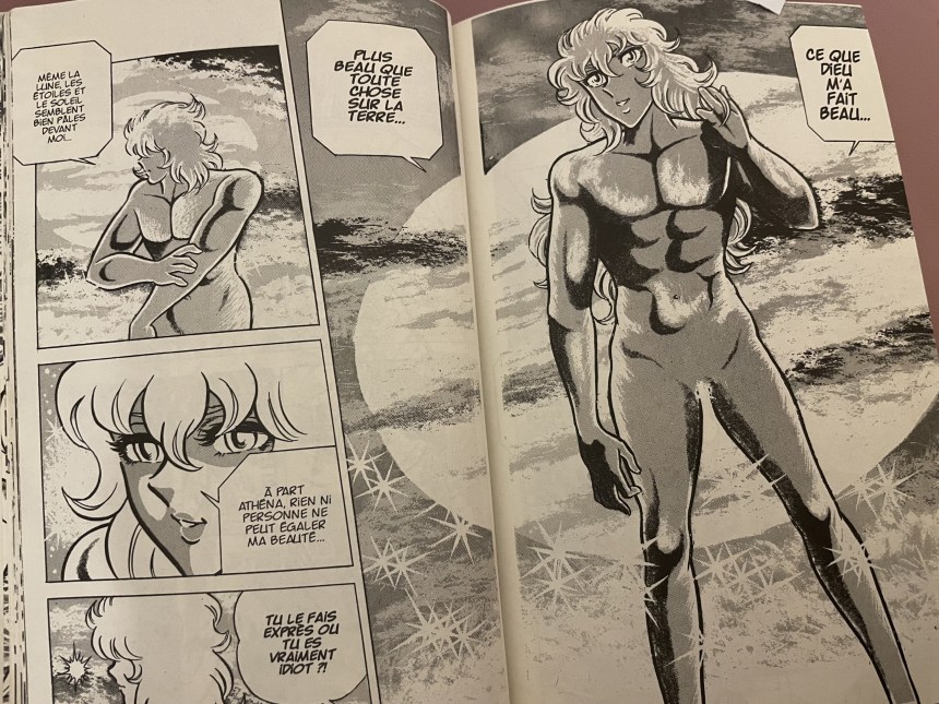 Entre le texte, les dessins et l’entrejambe censurée, y’a qui rien qui va 😂 En plus, c’est pas Aphrodite des Poissons le plus beau chevalier de tous ??